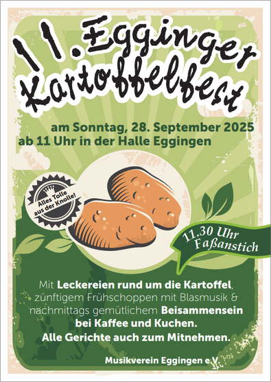 Am Sonntag, 28.9. findet wieder unser jährliches Kartoffelfest in der Gemeindehalle Eggingen statt.
